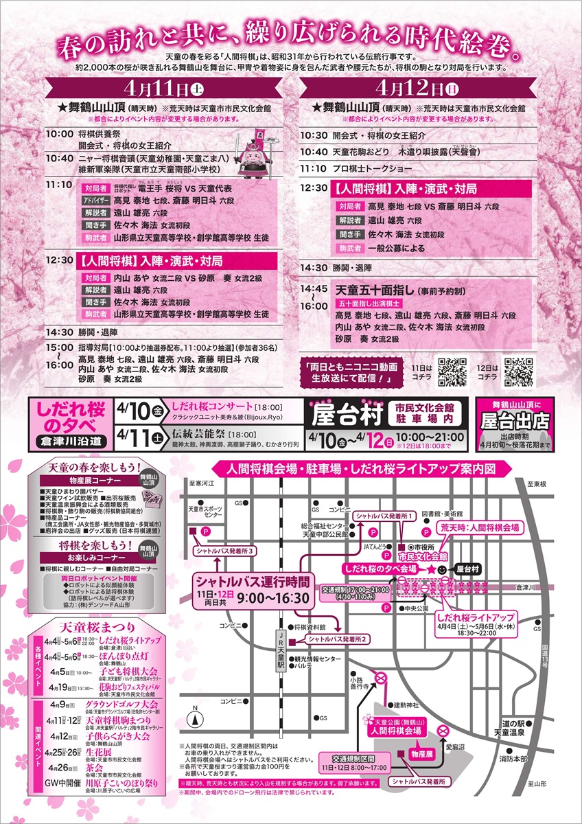 多くの方のご来場をお待ちしています。きのうの雨上がり、天童桜まつり「人間将棋」会場の舞鶴山に行ってみました!山形地方気象台が桜(ソメイヨシノ)の開花を発表しましたが、ふもとの駐車場付近は咲き始め、山頂広場でも数輪が咲いてました🌸気温の高い日が続くので、桜満開のイベントが期待されます♪