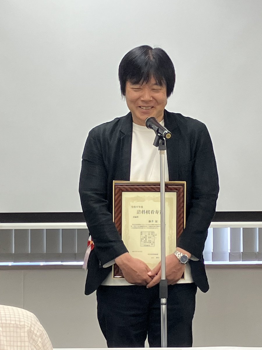 看寿賞長編賞の表彰を受ける藤井猛九段。