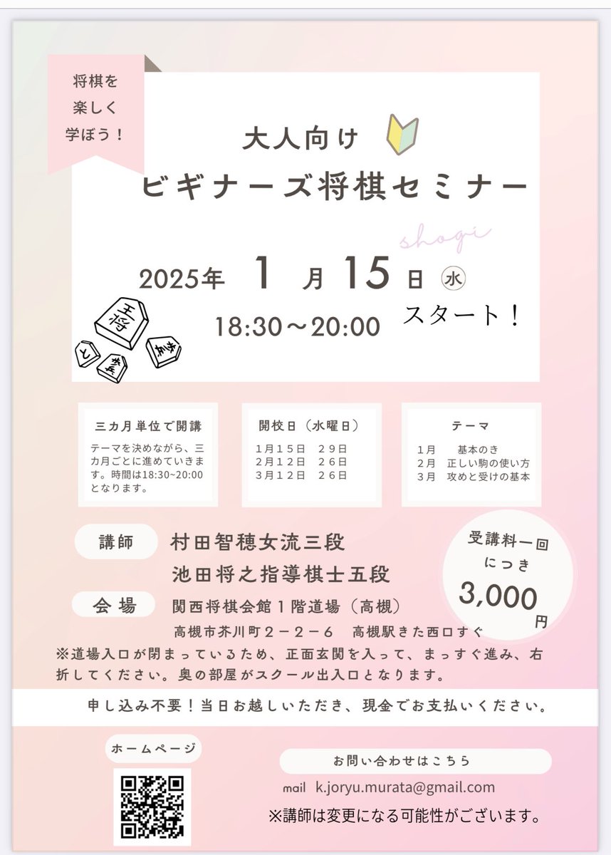 新ビギナーズセミナーが高槻の関西将棋会館1月15日(水)18時30分から開催予定です。