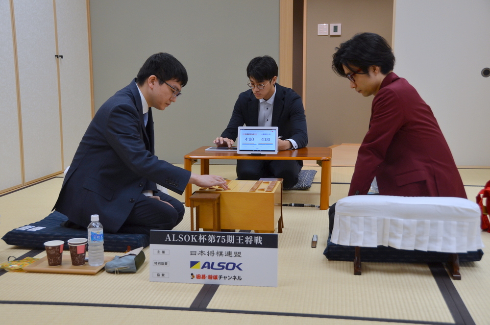#shogilive 翔@宗像>皆様こんにちは。本日は伊藤園お~いお茶杯王位戦第4局▲藤井聡太王位-△永瀬拓矢九段の1日目が行われています。藤井聡太王位が53手目を長考している際に対局室の不具合により対局を中断しましたが、現在は解決して再開しています。写真は昼休明けです。