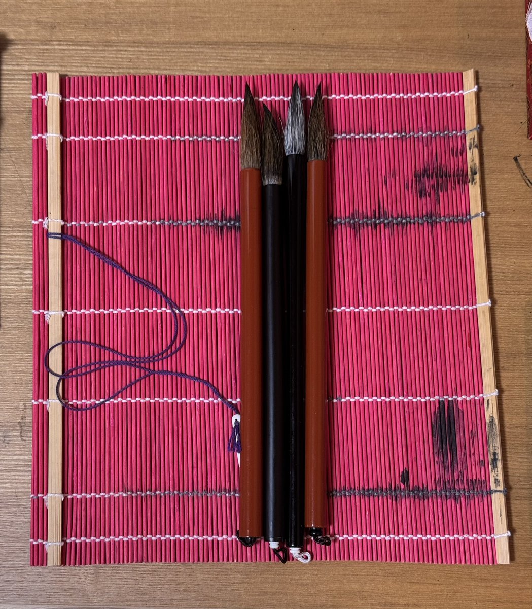 ① マイナビ出版さんに硯、墨、朱肉も含めて全て持参して書きました。筆は4本で途中で割れた時の予備、文字の大きさとその日の書いた感じで使い分けるためです😅 -