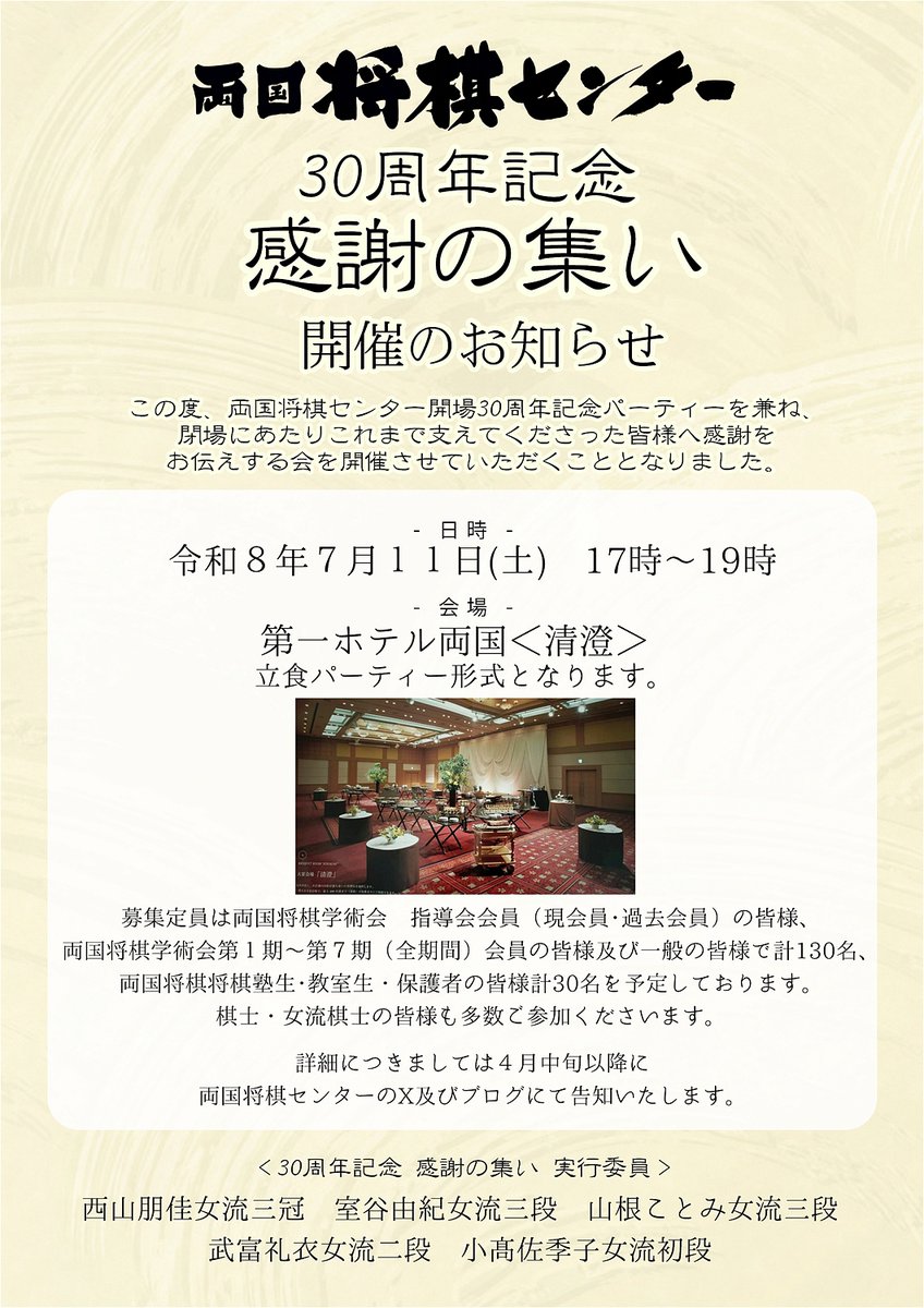 両国将棋センター開場30周年記念パーティーを兼ね、閉場にあたりこれまで支えてくださった皆様へ感謝をお伝えする会を7月11日(土)に開催させていただくこととなりました。詳細につきましては近日お知らせいたします。