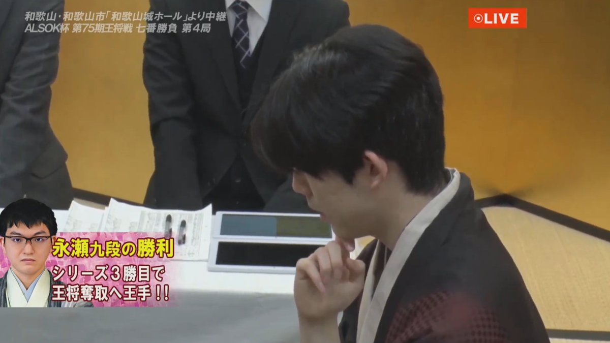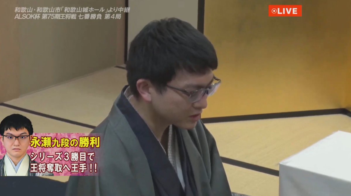 本日の対局は132手で永瀬九段が勝ち、シリーズ成績3勝1敗で王将奪取に王手をかけました。