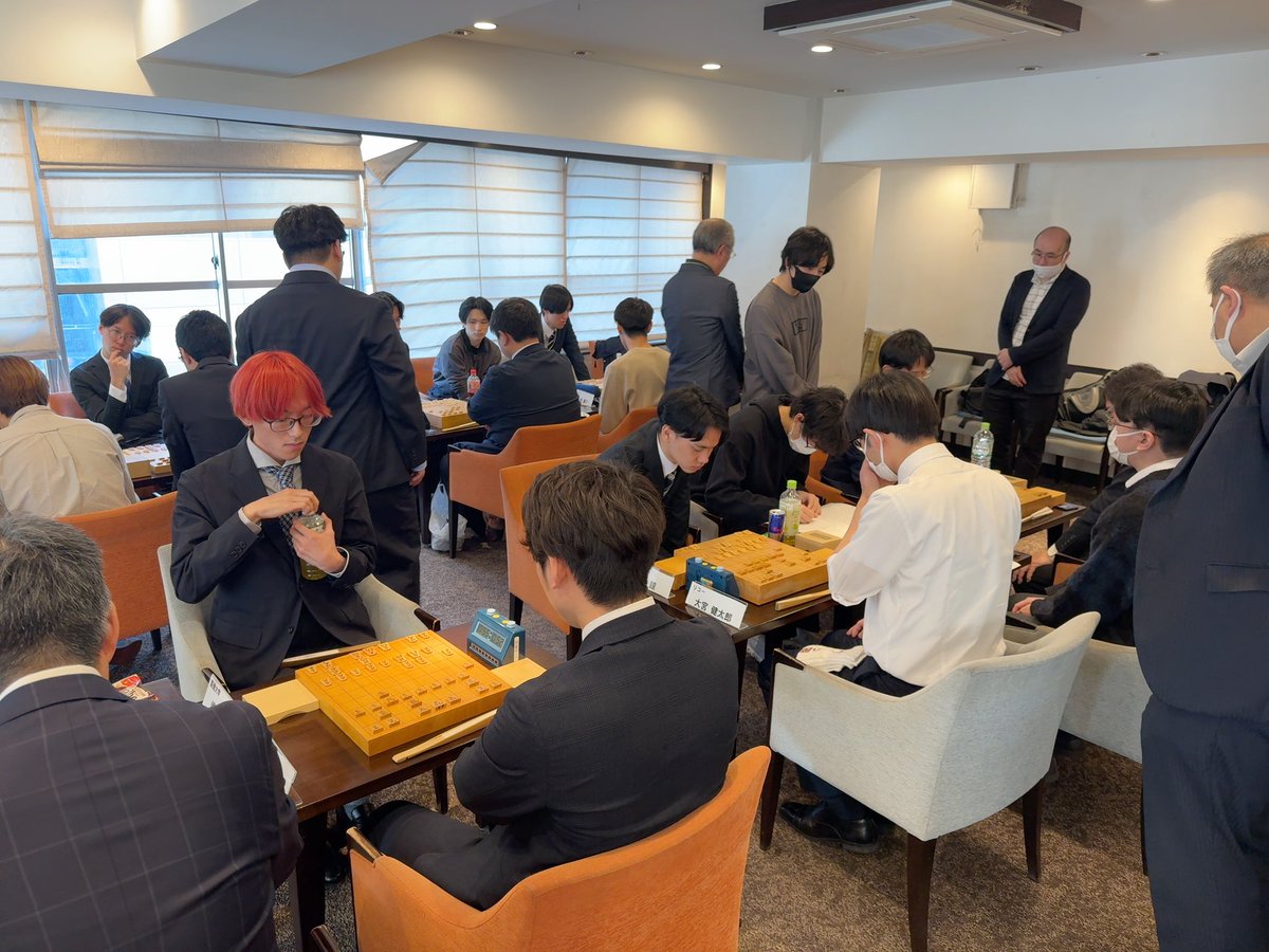 村)リコー杯アマチュア将棋団体日本選手権の取材に来ています。王座戦優勝の慶應大学と職団戦優勝のリコーが対戦しています。7人制で4勝したチームの優勝となります。慶応は26年ぶりの出場。当時の優勝メンバーを始め、OBの方たちが応援に来ています。