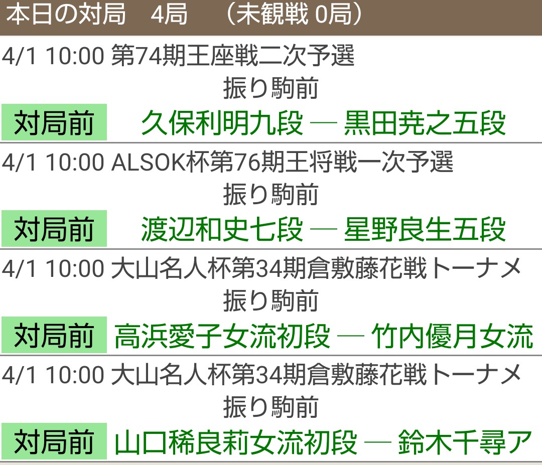 潤@大阪>将棋界は本日、新年度を迎えました。2026年度も日本将棋連盟モバイル中継をよろしくお願いいたします。4月1日(水)は大山名人杯第34期倉敷藤花戦戦1回戦、▲山口稀良莉女流初段-△鈴木千尋アマ戦を関西将棋会館よりお送りしています。戦型は先手三間飛車対後手右四間飛車です。