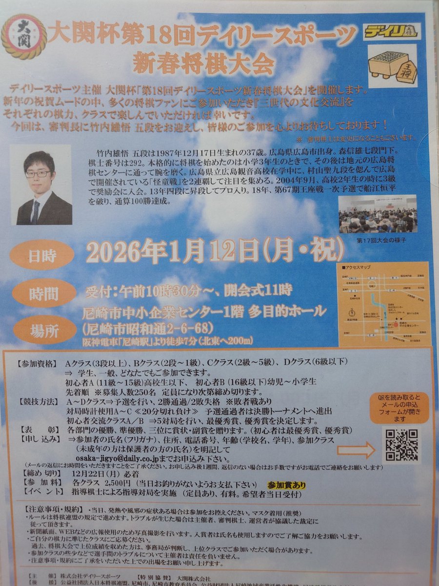 大会は当日参加もできるそうですので、ご都合良い方は是非😊(まほ)11月30日(日)は所司一門将棋センター