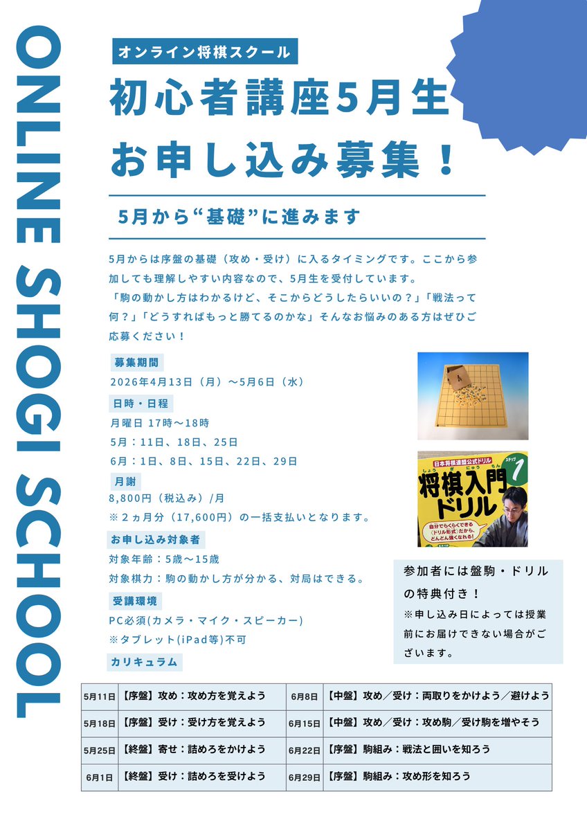 4月は入門編、5月からは序盤の攻め・受けの基礎に入ります。